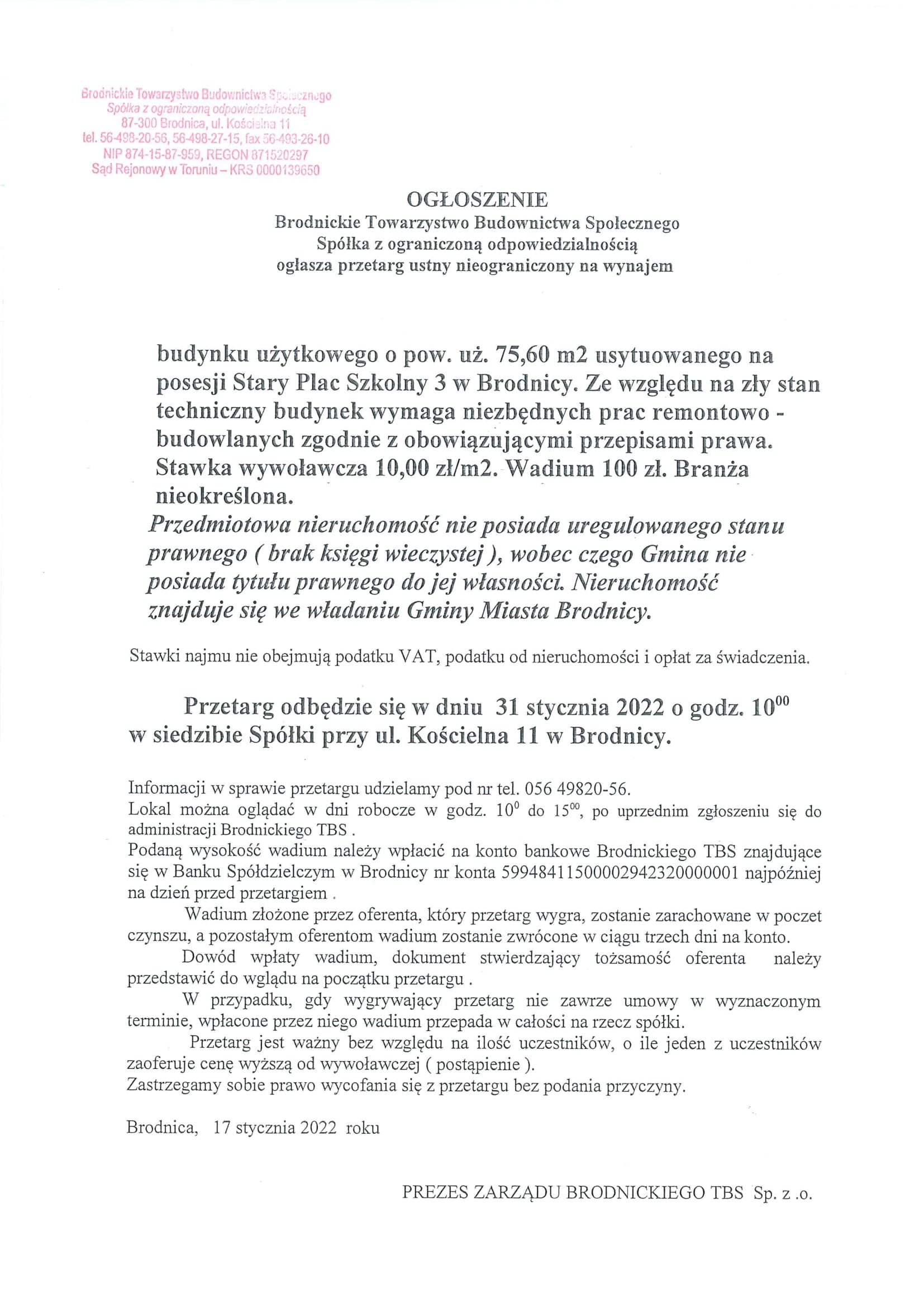 Przetarg ustny nieograniczony na wynajem