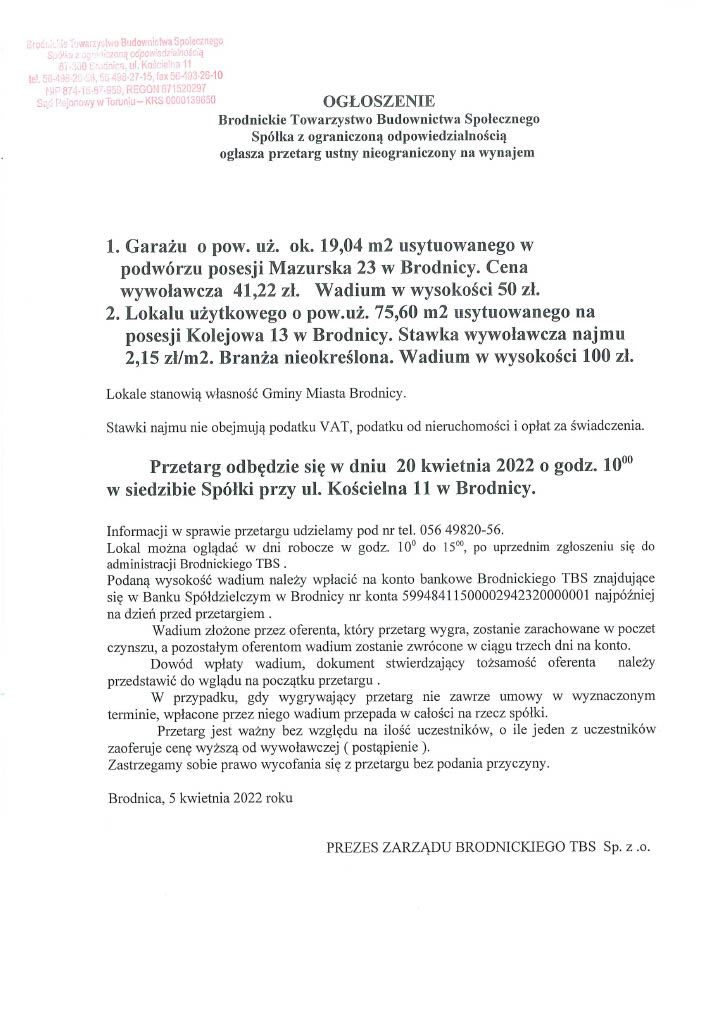 Przetarg ustny nieograniczony na wynajem