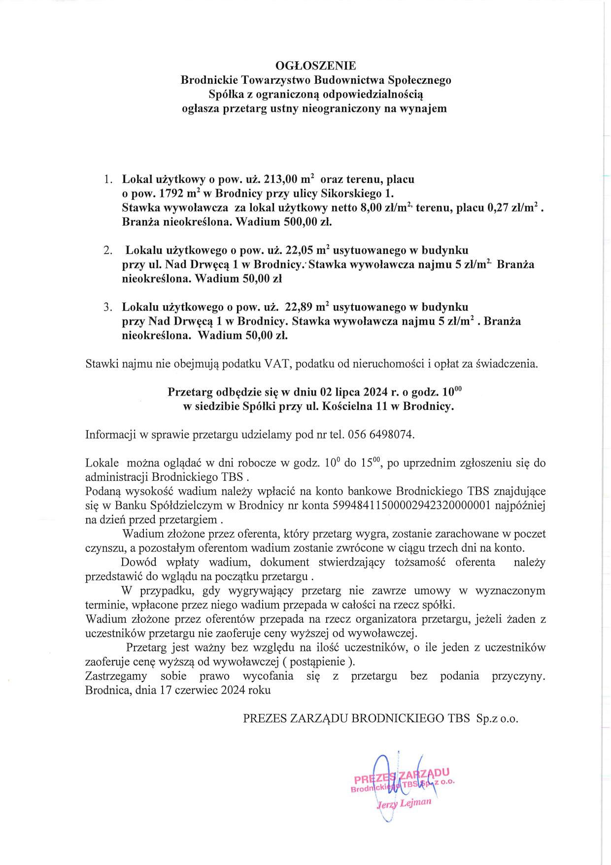 Przetarg Ustny Nieograniczony na Wynajem