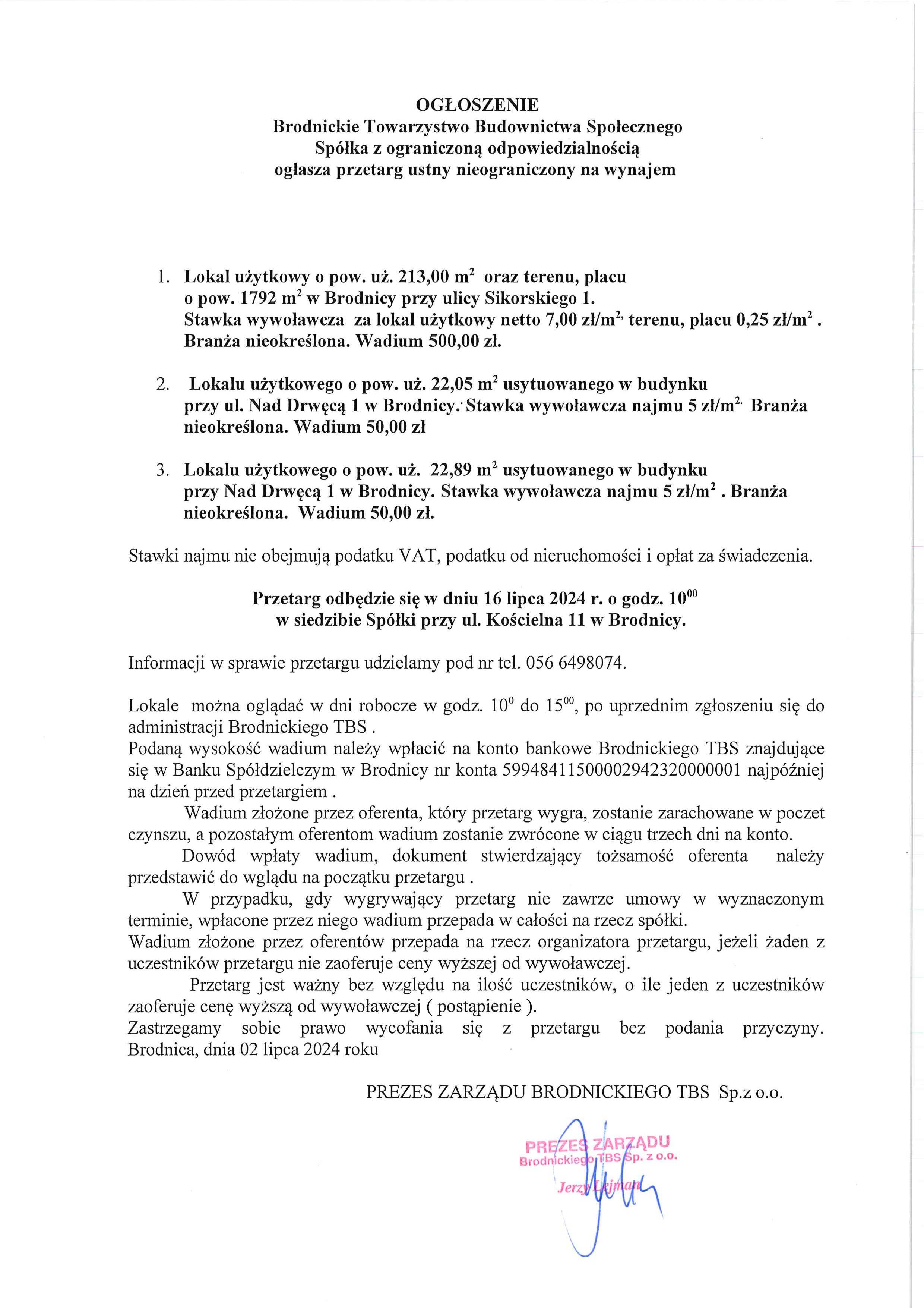 Przetarg ustny nieograniczony na wynajem
