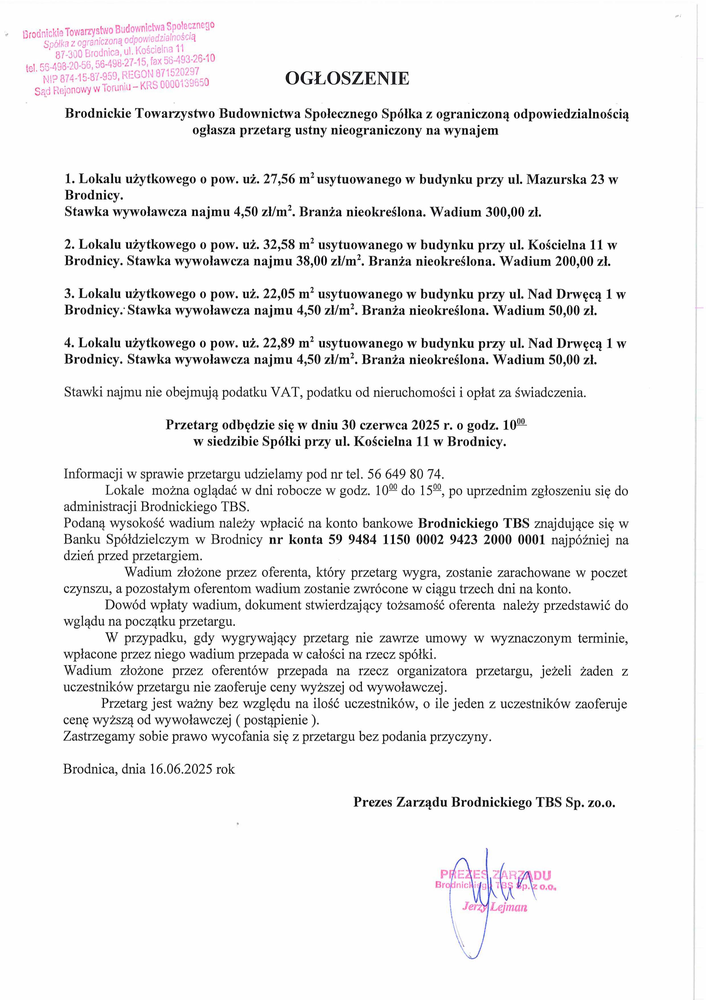 Przetarg ustny nieograniczony na wynajem